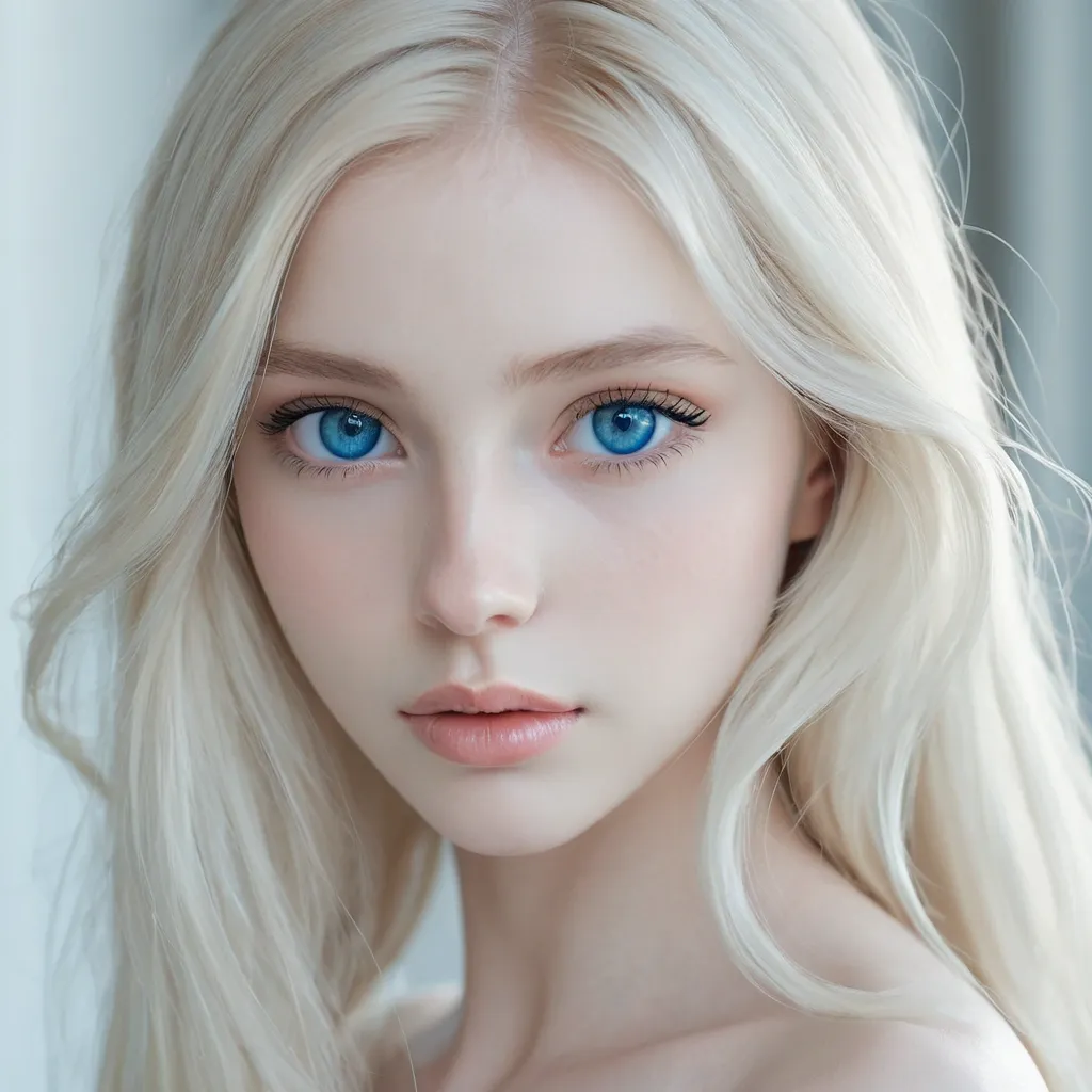 24 years old , She is a stunning Caucasian woman with an ethereal , anime-inspired elegance—entirely human , yet visually unforgettable. Her face is softly sculpted with high cheekbones and a gentle jawline , her porcelain skin smooth and luminous. Her large , vivid blue eyes are the focal point—bright , expressive , and reflective , framed by long lashes that give her gaze an almost illustrated clarity. A delicate , refined nose and softly full lips balance her features perfectly. Her thick blonde hair flows in smooth , intentional layers , framing her face like a living portrait.She doesn’t look like a cartoon—she looks like reality refined. ,