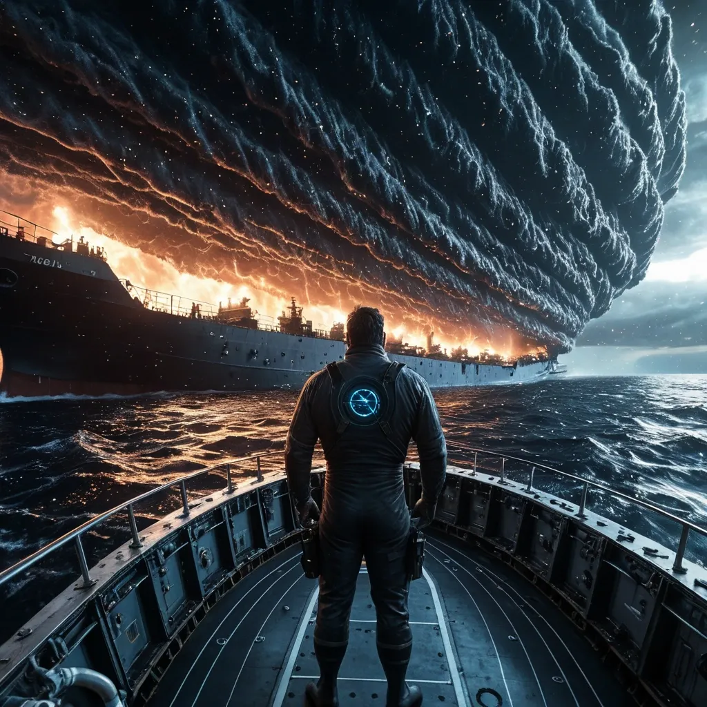 A side view on the cargo ship’s deck , a shocking scene unfolds. The crew stares off into the distance with terrified expressions , eyes wide and faces drawn — the perspective lingering on one fisherman in particular , his features tight with fear as if he’s just witnessed something terrible. Above the boat vertically vortex rings being — a future missiles built entirely on the back of a giant vortex rings that resembles a cosmic attacked of nebulae — glides over the vortex black-hole. The small vessel rocks gently on the blue sea , which still catches the last glow of sunlight and sparkles across the surface. The whole moment feels cinematic , bathed in natural light with realistic textures and meticulous detail. ,