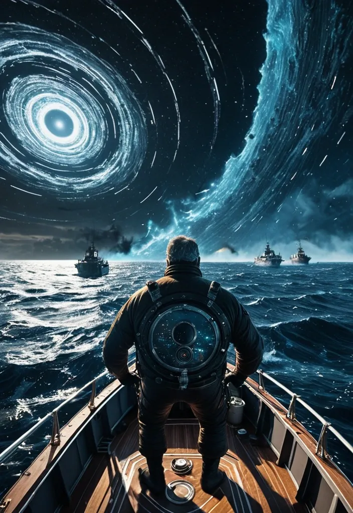 From a side view on the fishing boat’s deck , a shocking scene unfolds. The crew stares off into the distance with terrified expressions , eyes wide and faces drawn — the perspective lingering on one fisherman in particular , his features tight with fear as if he’s just witnessed something terrible. Above the boat vertically vortex rings being — a future missiles built entirely on the back of a giant vortex rings that resembles a cosmic city of stardust and nebulae — glides over the vortex black-hole. The small vessel rocks gently on the blue sea , which still catches the last glow of sunlight and sparkles across the surface. The whole moment feels cinematic , bathed in natural light with realistic textures and meticulous detail. ,