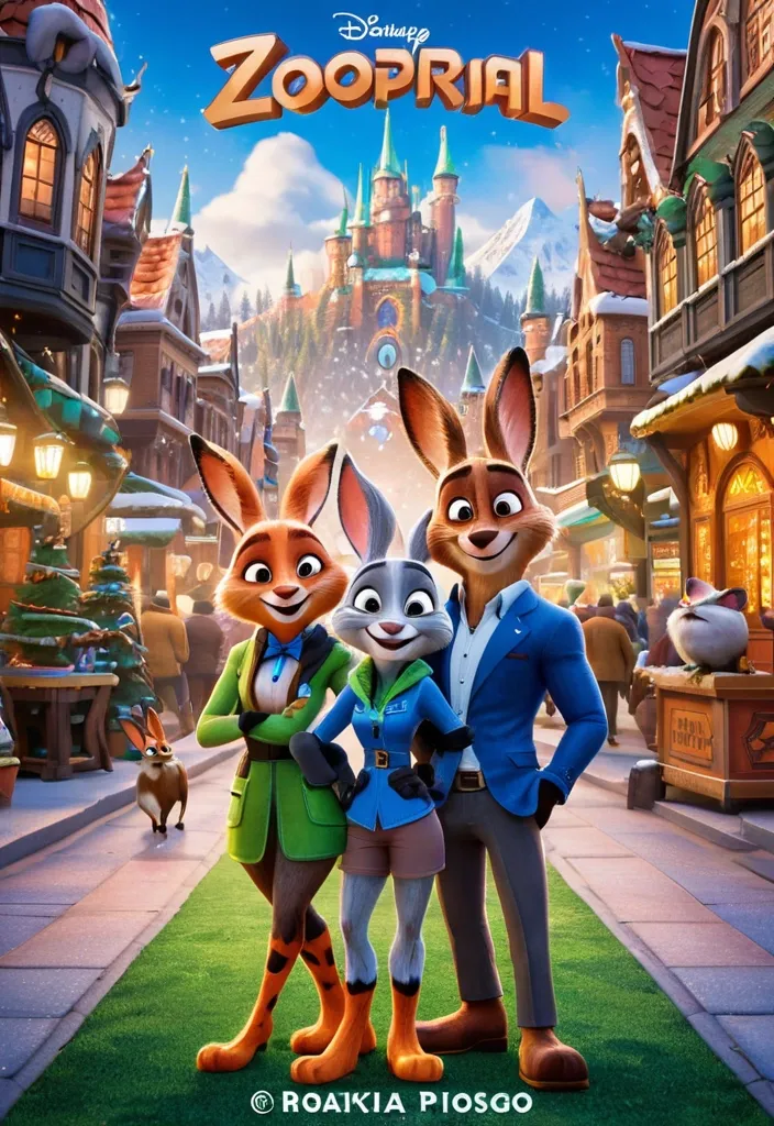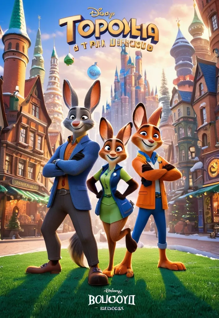 Children’s storybook cover , landscape format. Three real children as main characters: Danial , Alinur , Abai , realistic photo-accurate faces exactly matching the provided reference photos , no face alteration , no stylization on children. The children are standing together smiling , warmly lit , natural skin tones. Surround them with Zootopia characters (Judy Hopps , Nick Wilde) in cartoon Zootopia animation style. Bright , magical city of Zootopia in the background , festive and friendly mood. Book title in Kazakh language , beautifully styled fairy-tale typography: «Зверополистегі үш дос» Subtitle (smaller text): Даниал , Алинұр , Абай туралы ертегі ,