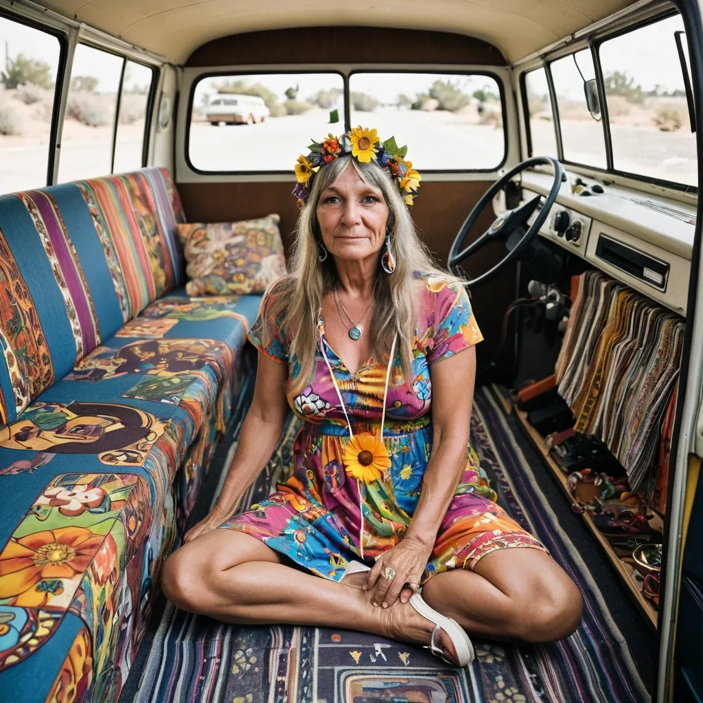 A color-xerox-looking psychedelic collage depicting an alien , dreamlike landscape composed of black and white and other optical illusion patterns , surreal organic , eye-like lifeforms and biomorphic structures , layered and arranged as if cut , assembled , and recomposed from multiple surreal realities. The scene feels like a collaged ecosystem built from perception itself — eyes embedded in plants , eyes floating independently , eyes growing on stalks , cones , mushrooms , and soft sculptural forms. Some eyes are realistic and detailed , others simplified , graphic , striped , or abstracted. A 1970 USA California a mature woman , wearing a colorful hippie dress with a flower wreath in her hair and playing a guitar. Elements overlap unnaturally , with intentional scale mismatches and layered planes that flatten and re-expand space. ,