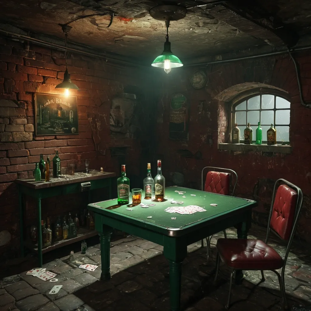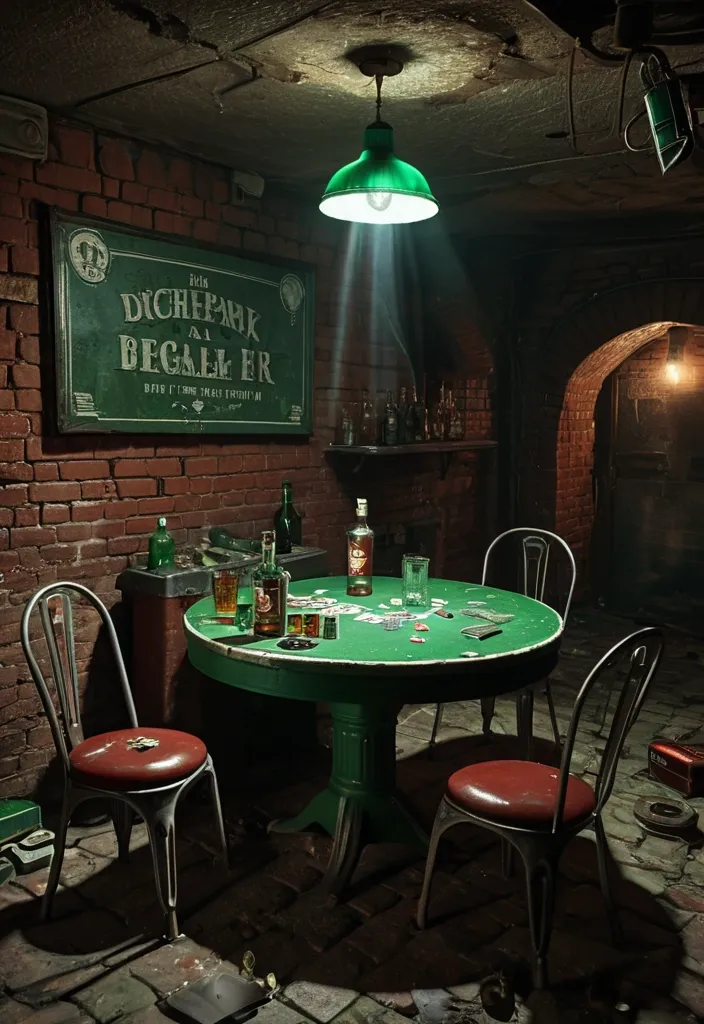 Chef-d'œuvre photoréaliste en pied , une grotte abandonnée avec des murs en briques rouges , une vieille table verte avec des cartes de poker dessus , des pièces aussi , trois verres de whisky et une bouteille inversée de celui-ci , un cendrier avec une cigarette consumée dessus , lumière provenant d'un éclairage au gaz sur les murs ,
