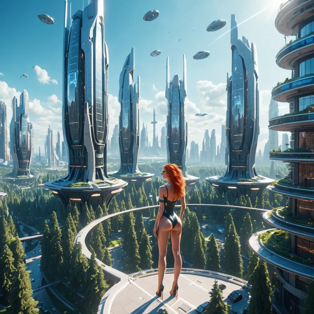 Photorealistic full lenght a futuristic luminous city with harmonious buildings and trees all in the city , some futuristic flying cars on sky between towers , on a forest planet , a beautiful european female redhead 23yo in short space swimsuit at first plan standing on a balcony , sunny afternoon cinematic science fiction style ,