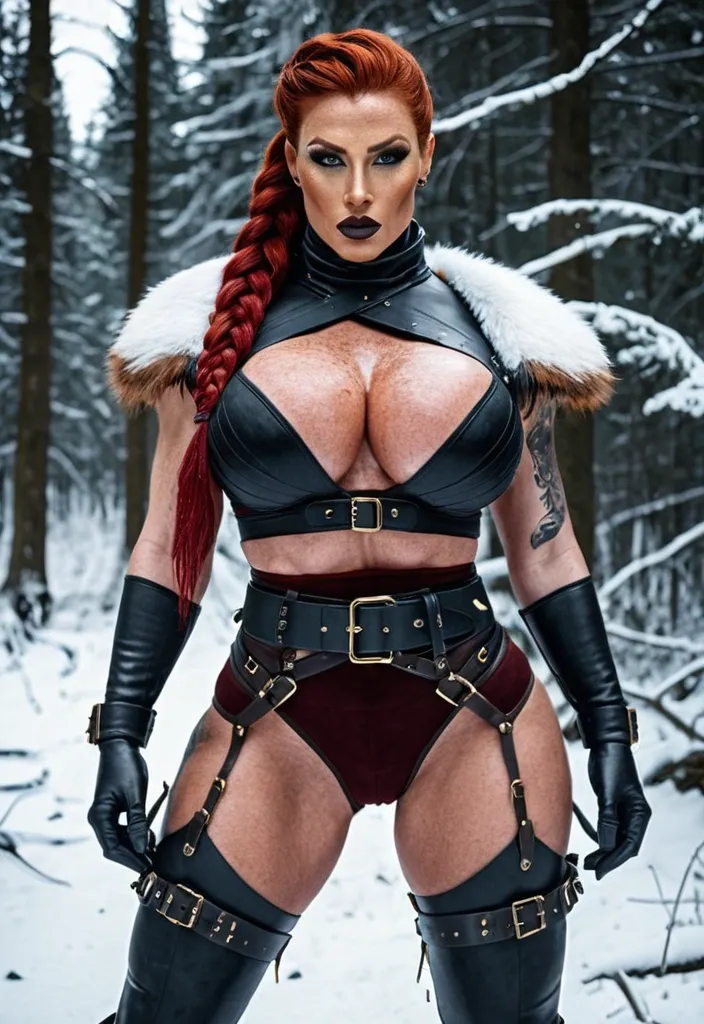 Generate Gorgeous female boss , bimbo , hourglass body , abnormally massive female bodybuilder , gorgeous , close up , full lips , big booty , redheaded , freckles on face and breast , braided design hair , feminine silhouette , too big breast , big booty , sexy thighs abs , silhouette , up close , flexing biceps , beautiful green eyes , legs are iconic and defining physical feature , both visually and in terms of combat ability.wearing an outfit that is a striking blend of elegance , power , and femininity , designed to command attention in any room. The suit is tailored to perfection , hugging the wearer’s curves with precision while emphasizing a structured silhouette. The fabric itself is a refined grey tweed patterned with subtle white grid lines , giving the suit a texture that feels both sophisticated and modern. The blazer features broad blue lapels and gold button accents , adding a luxurious touch that elevates the look beyond typical business attire. The matching high-waisted trousers elongate the frame , further enhancing the poised and commanding effect of the ensemble.The styling choices amplify the boldness of the suit. The inner blouse is a silky , greybutton-down shirt that complements the tweed’s tone while introducing a softer , feminine balance to the sharp tailoring of the jacket. The blouse peeks out neatly from under the blazer , maintaining elegance without drawing focus away from the suit’s commanding cut. Accessories are kept minimal yet intentional: a delicate layered gold necklace and hoop earrings that add glimmers of light and luxury without overpowering the outfit. The choice of voluminous , honey-brown braids cascading down her shoulders frames the face with both confidence and glamour , completing the commanding visual.Altogether , this look communicates a blend of authority and allure. It is business-ready yet fashion-forward , balancing corporate structure with vibrant femininity. The color palette blue , grey and gold avoids being overly delicate , instead embracing the richness of texture , structure , and presence. This is the kind of ensemble that speaks to ambition , sophistication , and personal style—ideal for someone who thrives in positions of influence but insists on expressing her individuality with bold elegance. It’s not just clothing—it’s a statement of power wrapped in grace. In luxury living legs that could crush a watermelon , skirt high boots are a bold and striking statement piece , crafted in glossy black patent leather that gives them a sleek , polished finish. Rising to just below the knee , the boots feature three adjustable buckle straps along the shaft , adding both edge and detail to their design. The towering stiletto heel , paired with a thick platform sole , creates an ultra-dramatic silhouette that elongates the leg and exudes power and confidence. With their combination of shine , height , and structure , these boots perfectly balance fierce femininity with high-fashion allure. Massive breast , massive cleavage , Up close shot She wears a rugged , cold-weather warrior outfit with a dark leather crop top , fur-trimmed accents , a belted asymmetrical skirt , and sturdy boots , blending practicality with a fierce , battle-ready look.The scene places her in a snowy forest clearing surrounded by tall trees and frost-covered stones , creating a stark , wintry atmosphere that emphasizes strength and survival. ,