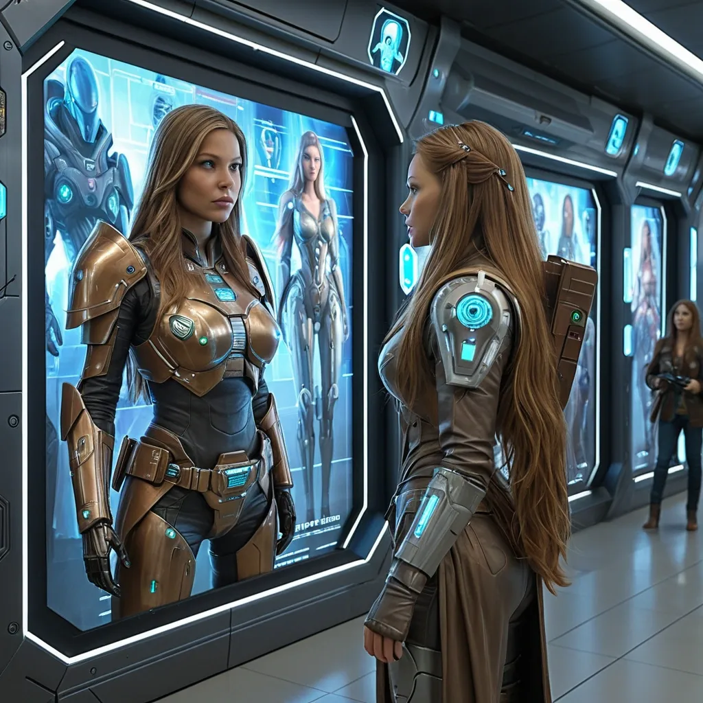 Chef-d'œuvre photoréaliste grandeur nature , une belle femme aux cheveux longs châtain clair en armure futuriste de chasseur de prime regarde un mur d'hologramme représentant des portraits avec le montant des primes dessus , la scène se déroule dans un aéroport futuriste , dans le décor on peut voir des aliens de différentes espèces ,