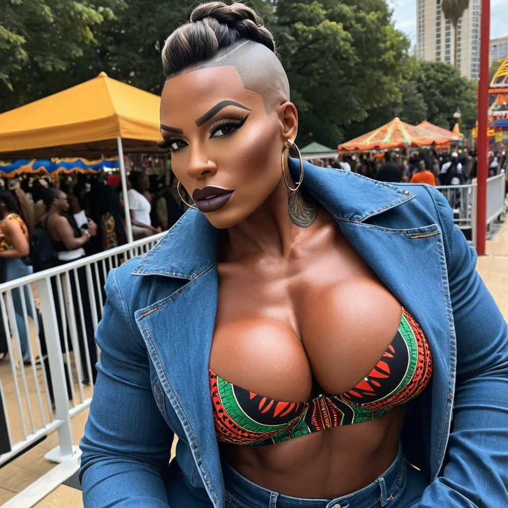 Generate Gorgeous female boss , bimbo , very dark-skinned African-American female , hourglass body , abnormally massive female bodybuilder , gorgeous , close up , full lips , big booty , brown , on face and breast , short pixie hair , shaved on the side , feminine silhouette , too big breast , big booty , sexy thighs abs , silhouette , up close , flexing biceps , beautiful green eyes , legs are iconic and defining physical feature , both visually and in terms of combat ability.wearing an outfit that is a striking blend of elegance , power , and femininity , designed to command attention in any room. The suit is tailored to perfection , hugging the wearer’s curves with precision while emphasizing a structured silhouette. The fabric itself is a refined grey tweed patterned with subtle white grid lines , giving the suit a texture that feels both sophisticated and modern. The blazer features broad blue lapels and gold button accents , adding a luxurious touch that elevates the look beyond typical business attire. The matching high-waisted trousers elongate the frame , further enhancing the poised and commanding effect of the ensemble.The styling choices amplify the boldness of the suit. The inner blouse is a silky , greybutton-down shirt that complements the tweed’s tone while introducing a softer , feminine balance to the sharp tailoring of the jacket. The blouse peeks out neatly from under the blazer , maintaining elegance without drawing focus away from the suit’s commanding cut. Accessories are kept minimal yet intentional: a delicate layered gold necklace and hoop earrings that add glimmers of light and luxury without overpowering the outfit. The choice of voluminous , honey-brown braids cascading down her shoulders frames the face with both confidence and glamour , completing the commanding visual.Altogether , this look communicates a blend of authority and allure. It is business-ready yet fashion-forward , balancing corporate structure with vibrant femininity. The color palette blue , grey and gold avoids being overly delicate , instead embracing the richness of texture , structure , and presence. This is the kind of ensemble that speaks to ambition , sophistication , and personal style—ideal for someone who thrives in positions of influence but insists on expressing her individuality with bold elegance. It’s not just clothing—it’s a statement of power wrapped in grace. In luxury living legs that could crush a watermelon , skirt high boots are a bold and striking statement piece , crafted in glossy black patent leather that gives them a sleek , polished finish. Rising to just below the knee , the boots feature three adjustable buckle straps along the shaft , adding both edge and detail to their design. The towering stiletto heel , paired with a thick platform sole , creates an ultra-dramatic silhouette that elongates the leg and exudes power and confidence. With their combination of shine , height , and structure , these boots perfectly balance fierce femininity with high-fashion allure. High cheekbones , prominent jawline , gorgeous big light reflecting hazel eyes , enormous breast , cartoon bunny on yellow t-shirt-shirt , denim shorts , denim baseball cap walking in amusement park , ,
