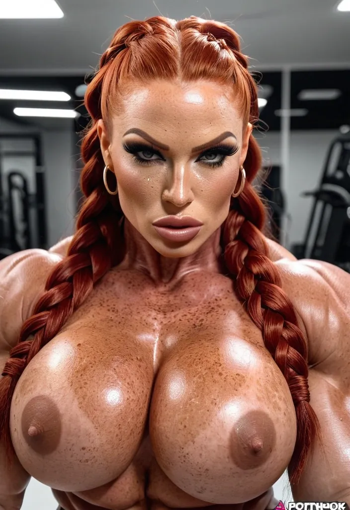 Generate Gorgeous female boss , 34 years old , Japanese woman , pointy face , bimbo , hourglass body , abnormally massive female bodybuilder , gorgeous , close up , full lips , big booty , red hair breast , short bob-cut , bangs cover forhead design hair , feminine silhouette , too big breast , big booty , sexy thighs abs , silhouette , up close , flexing biceps , beautiful green eyes , legs are iconic and defining physical feature , both visually and in terms of combat ability.wearing an outfit that is a striking blend of elegance , power , and femininity , designed to command attention in any room. The suit is tailored to perfection , hugging the wearer’s curves with precision while emphasizing a structured silhouette. The fabric itself is a refined grey tweed patterned with subtle white grid lines , giving the suit a texture that feels both sophisticated and modern. The blazer features broad blue lapels and gold button accents , adding a luxurious touch that elevates the look beyond typical business attire. The matching high-waisted trousers elongate the frame , further enhancing the poised and commanding effect of the ensemble.The styling choices amplify the boldness of the suit. The inner blouse is a silky , greybutton-down shirt that complements the tweed’s tone while introducing a softer , feminine balance to the sharp tailoring of the jacket. The blouse peeks out neatly from under the blazer , maintaining elegance without drawing focus away from the suit’s commanding cut. Accessories are kept minimal yet intentional: a delicate layered gold necklace and hoop earrings that add glimmers of light and luxury without overpowering the outfit. The choice oframes the face with both confidence and glamour , completing the commanding visual.Altogether , this look communicates a blend of authority and allure. It is business-ready yet fashion-forward , balancing corporate structure with vibrant femininity. The color palette blue , grey and gold avoids being overly delicate , instead embracing the richness of texture , structure , and presence. This is the kind of ensemble that speaks to ambition , sophistication , and personal style—ideal for someone who thrives in positions of influence but insists on expressing her individuality with bold elegance. It’s not just clothing—it’s a statement of power wrapped in grace. In luxury living legs that could crush a watermelon , skirt high boots are a bold and striking statement piece , crafted in glossy black patent leather that gives them a sleek , polished finish. Rising to just below the knee , the boots feature three adjustable buckle straps along the shaft , adding both edge and detail to their design. The towering stiletto heel , paired with a thick platform sole , creates an ultra-dramatic silhouette that elongates the leg and exudes power and confidence. With their combination of shine , height , and structure , these boots perfectly balance fierce femininity with high-fashion allure. Gorgeous brown eyes , big lips glossy lips , enormous breast , enormous butt , up close shot , up close shot , massive cleavage ,