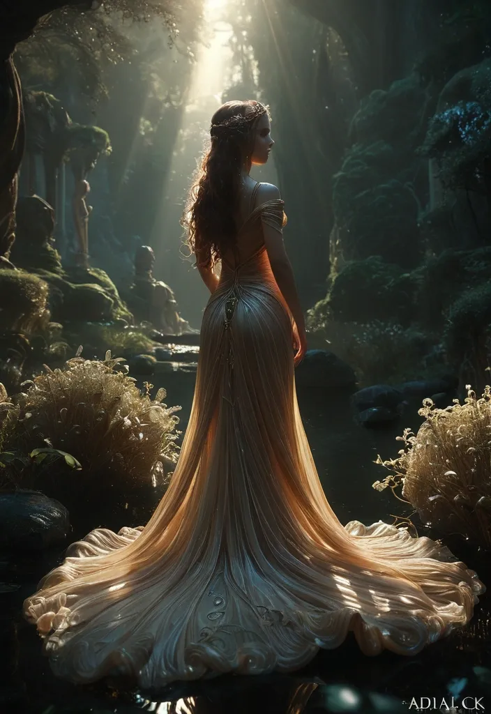 A stunning 8K hyperrealistic , highly detailed cinematic photograph , captured from a dramatic high-wide angle , presenting a full-body view of a captivating Forest Nymph. She features long , flowing brown wavy hair that cascades elegantly , and is adorned in a breathtakingly elegant , full-body gown crafted entirely from sheer , translucent , flowing fabric that subtly reveals her form and gracefully accentuates her divine silhouette. She poses gracefully amidst a breathtaking , enigmatic landscape inspired by the most prestigious designer of nature , goddess Aphrodite. The scenery features lush , vibrant foliage , delicate flowers , and shimmering , mystical elements that evoke divine , otherworldly beauty and deep harmony , illuminated by a soft , ethereal , and somewhat hazy glow , enhancing a truly mysterious atmosphere. The Nymph’s posture exudes confidence and grace , with intricate details in her gown , hair , and accessories , capturing a sense of timeless elegance. The scene is rendered in a highly detailed , realistic style with a pronounced touch of fantasy , emphasizing luminous textures and harmonious , subtly shadowed composition. At the bottom of the image , include a radiant , opulent 3D inscription of the name "Elçin Sangu , " crafted in a neoclassical style with elegant , flowing lines , reminiscent of Cervantine artistry , adding a regal and energetic glow that enhances the overall sophistication and vitality of the scene. The visual framing combines a balanced composition with a focus on the Nymph as the central figure , surrounded by the divine landscape , creating a majestic and captivating , mysterious atmosphere. The lighting is soft , deeply luminous , and otherworldly , highlighting the divine inspiration behind the scene and emphasizing the goddess-like aura of the Nymph within this enchanting , almost secretive , environment. ,