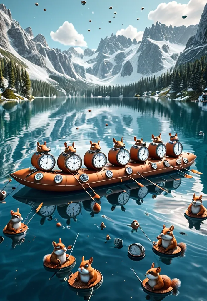 A surreal , hyper-realistic 3D render of a serene mountain lake , but the water's surface is perfectly still and reflects a sky filled with an impossible arrangement of clocks , all showing slightly different times , with prominent '6's and '7's. Tiny , anthropomorphic squirrels wearing tiny numbered vests (one '6' , one '7') are fishing from a small , floating raft. The style is hyper-detailed and polished , evoking a dreamlike yet tangible atmosphere. ,