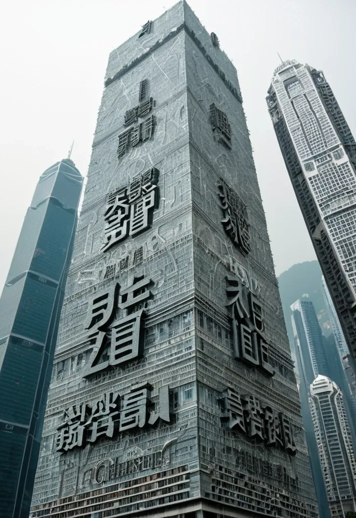 A colossal , skyscraper text "King Kong" rises , its surface etched with intricate , number-inspired glass cube carvings. The text "6-7"'s facades are densely populated with a Hong Kong where fantasy and reality intertwine , representing only a specific Hong Kong but also symbolizing human desire , ideals and the inevitable sense of loss. The Hong Kong's skyscraper all spiral paper staircases inlaid with spiral-ling papers , suggesting access to a higher realm; a place where one can make perfect telescopes and violins. Hong Kong is a completely sustainable skyscraper. ,