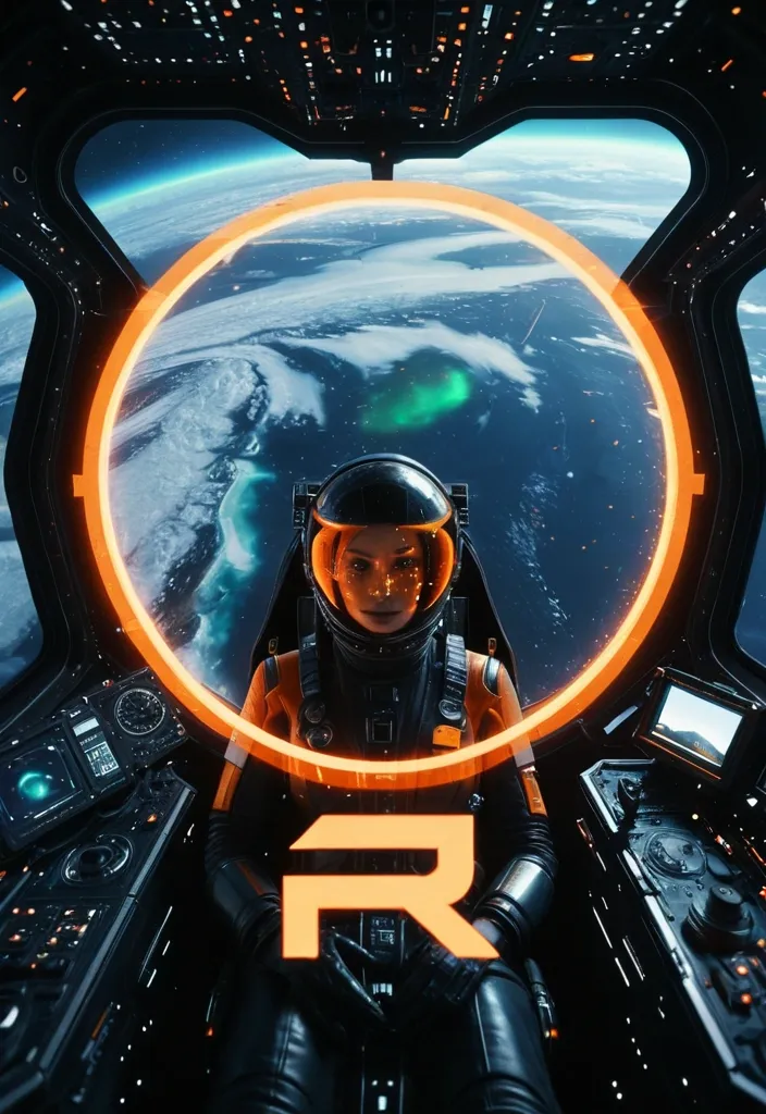 Ultra-realistic cinematic sequence. Aerial shot , extreme vertical view of a camera orbits at 90 degrees , a high-tech spacecraft uniquely Orange text "R" shaped , a female pilot sitting in the glass cockpit , flying over ocean landscape covered in shimmering silver glitter , bathed in a Aurora as the Northern Lights and dark black palette. Science fiction influences , 32K UHD , atmospheric installations , otherworldly visions , fluorescent colors , ethereal glow , futuristic aesthetics. ,