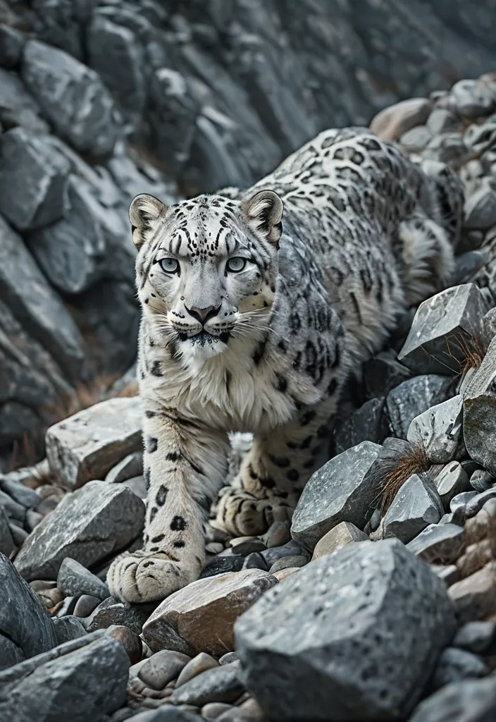 A high-resolution nature scene where a snow leopard is hidden in rocky terrain through near-perfect camouflage. The illusion type is “search image”: at first glance it’s just rocks; after a moment the leopard’s face and body become clear. Lighting: overcast mountain light , muted colors , high detail. Ensure the leopard’s edges blend naturally with rocks , but eyes remain subtly readable. Use realistic depth , slight atmospheric perspective , sharp textures. No humans , no text , no arrows , no circles , no hints , just the hidden subject ,