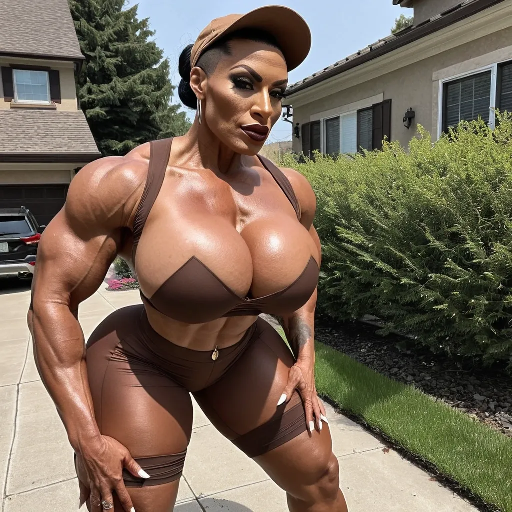 Generate Gorgeous female boss , bimbo , 42 years old , African-American woman , , , hourglass body , abnormally massive female bodybuilder , gorgeous , close up , full lips , big booty , buzz cut , black hair , hair bun , feminine silhouette , too big breast , big booty , sexy thighs abs , silhouette , up close , flexing biceps , gorgeous brown eyes , legs are iconic and defining physical feature , both visually and in terms of combat ability.wearing an outfit that is a striking blend of elegance , power , and femininity , designed to command attention in any room. The suit is tailored to perfection , hugging the wearer’s curves with precision while emphasizing a structured silhouette. The fabric itself is a refined grey tweed patterned with subtle white grid lines , giving the suit a texture that feels both sophisticated and modern. The blazer features broad blue lapels and gold button accents , adding a luxurious touch that elevates the look beyond typical business attire. The matching high-waisted trousers elongate the frame , further enhancing the poised and commanding effect of the ensemble.The styling choices amplify the boldness of the suit. The inner blouse is a silky , greybutton-down shirt that complements the tweed’s tone while introducing a softer , feminine balance to the sharp tailoring of the jacket. The blouse peeks out neatly from under the blazer , maintaining elegance without drawing focus away from the suit’s commanding cut. Accessories are kept minimal yet intentional: a delicate layered gold necklace and hoop earrings that add glimmers of light and luxury without overpowering the outfit. The choice of voluminous , honey-brown braids cascading down her shoulders frames the face with both confidence and glamour , completing the commanding visual.Altogether , this look communicates a blend of authority and allure. It is business-ready yet fashion-forward , balancing corporate structure with vibrant femininity. The color palette blue , grey and gold avoids being overly delicate , instead embracing the richness of texture , structure , and presence. This is the kind of ensemble that speaks to ambition , sophistication , and personal style—ideal for someone who thrives in positions of influence but insists on expressing her individuality with bold elegance. It’s not just clothing—it’s a statement of power wrapped in grace. In luxury living legs that could crush a watermelon , skirt high boots are a bold and striking statement piece , crafted in glossy black patent leather that gives them a sleek , polished finish. Rising to just below the knee , the boots feature three adjustable buckle straps along the shaft , adding both edge and detail to their design. The towering stiletto heel , paired with a thick platform sole , creates an ultra-dramatic silhouette that elongates the leg and exudes power and confidence. With their combination of shine , height , and structure , these boots perfectly balance fierce femininity with high-fashion allure. High cheekbones , prominent jawline , gorgeous big brown eyes , , enormous breast , wearing brown collard shirt , brown fit-it cap , brown shorts , walking on drive way carring bending over working on plants in yard , profile shot ,