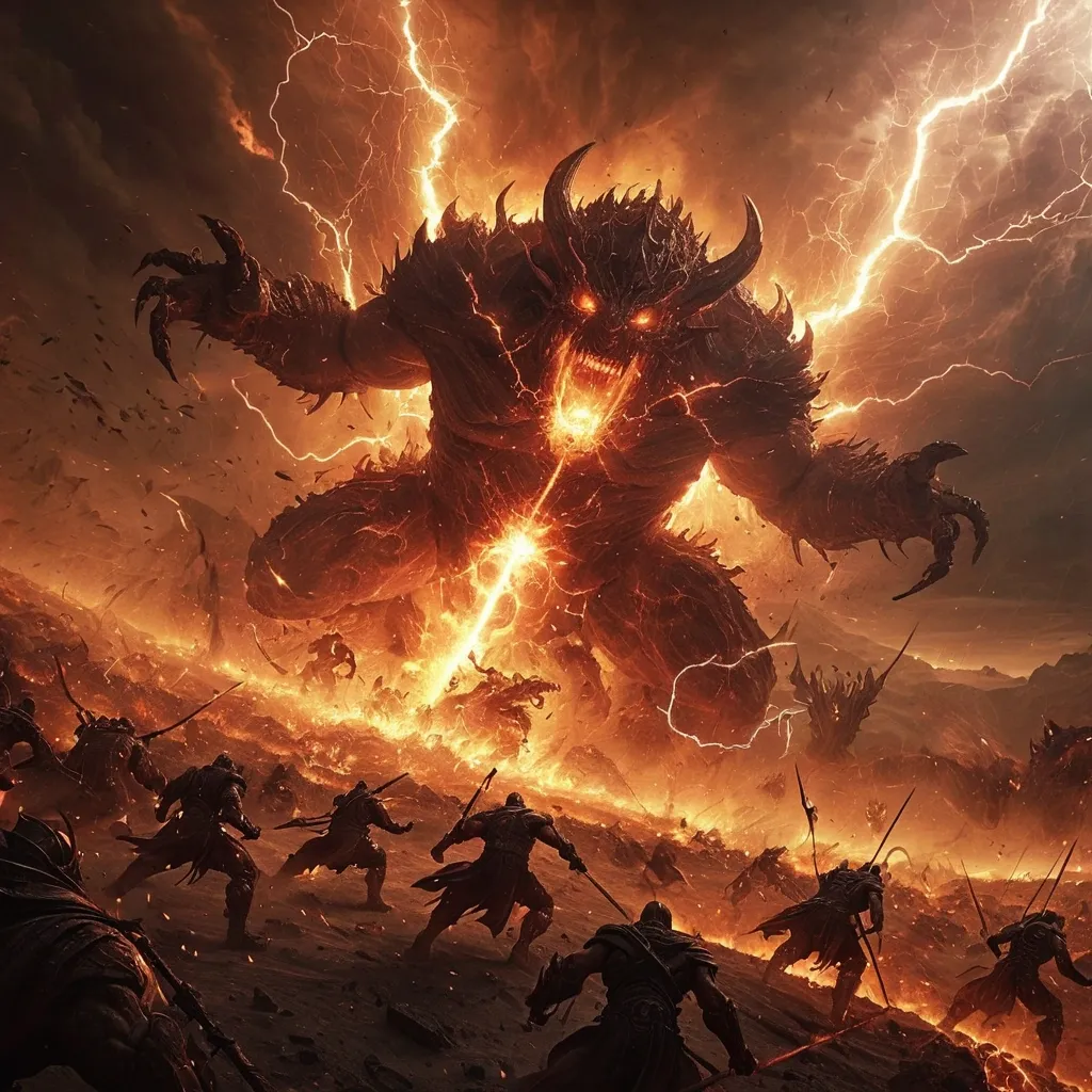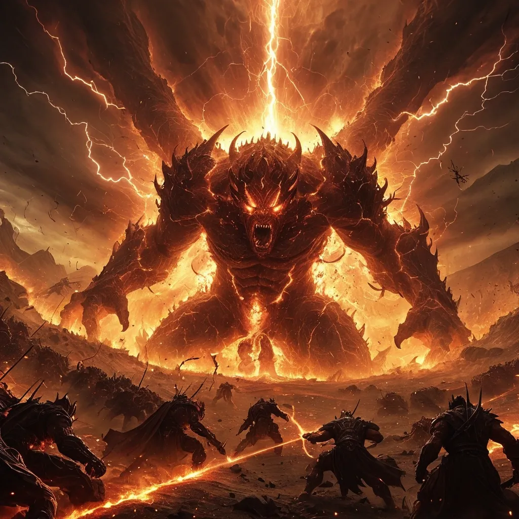 La grieta temporal se desestabiliza y libera una explosión colosal de energía. Demonios son arrastrados hacia el abismo mientras el viento y la luz lo devoran todo. El campo de batalla queda envuelto en polvo , fuego y relámpagos. Escena dramática , fuerza descomunal , punto de quiebre del conflicto. ,