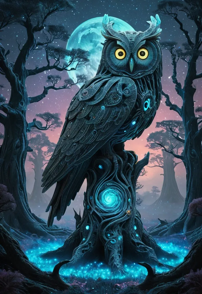 An ancient , colossal owl with eyes like swirling nebulae perches on a gnarled , bioluminescent tree. The scene is set in a forgotten forest where the air shimmers with ethereal energy. Strange , glowing flora carpets the ground , and distant , minimalist spaceships drift silently through a twilight sky. The style is a blend of highly detailed surrealism with photorealistic textures , evoking a dreamlike , transcendental experience. ,