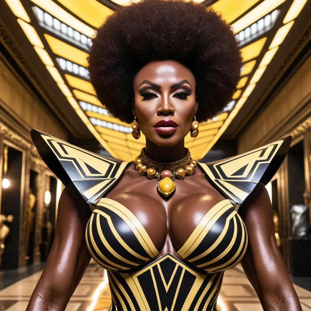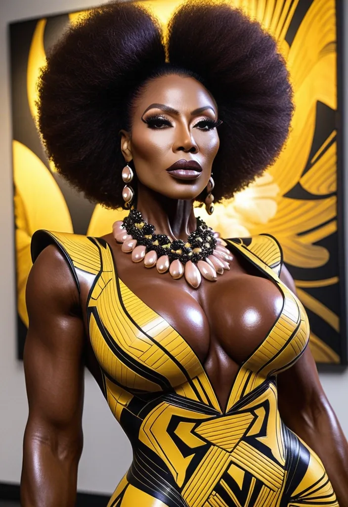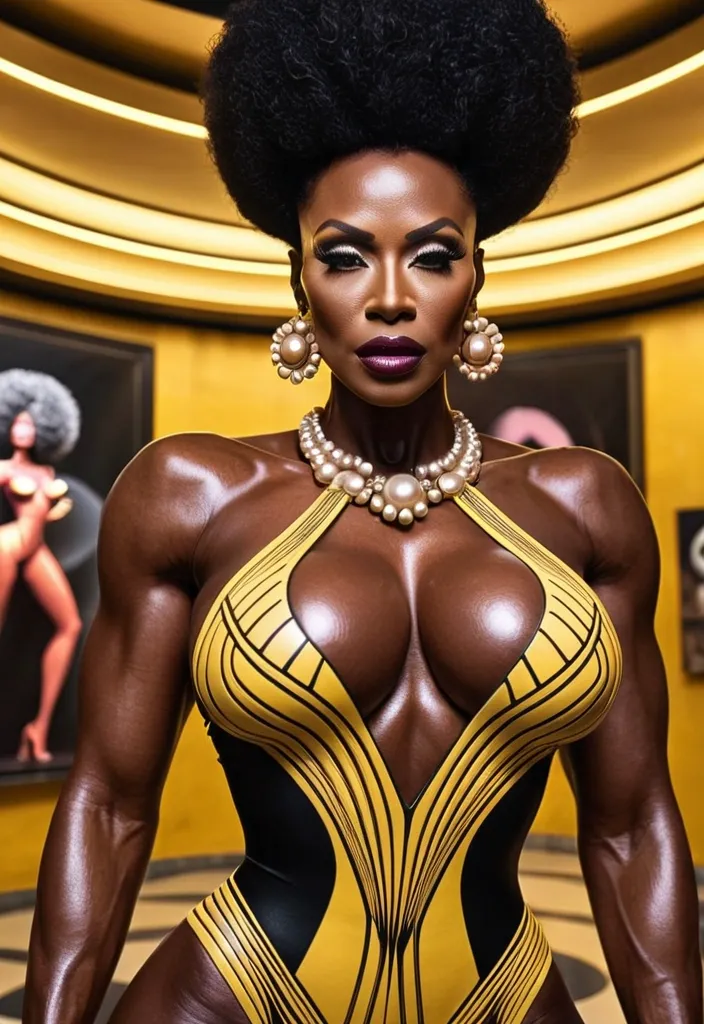 Generate Gorgeous 42 years old , female boss , dark-skinned African-American woman , pointy face , bimbo , hourglass body , abnormally massive female bodybuilder , gorgeous , close up , full lips , big booty , stylish futuristic afro , , feminine silhouette , too big breast , big booty , sexy thighs abs , silhouette , up close , flexing biceps , beautiful brown eyes , legs are iconic and defining physical feature , both visually and in terms of combat ability.wearing an outfit that is a striking blend of elegance , power , and femininity , designed to command attention in any room. The suit is tailored to perfection , hugging the wearer’s curves with precision while emphasizing a structured silhouette. The fabric itself is a refined grey tweed patterned with subtle white grid lines , giving the suit a texture that feels both sophisticated and modern. The blazer features broad blue lapels and gold button accents , adding a luxurious touch that elevates the look beyond typical business attire. The matching high-waisted trousers elongate the frame , further enhancing the poised and commanding effect of the ensemble.The styling choices amplify the boldness of the suit. The inner blouse is a silky , greybutton-down shirt that complements the tweed’s tone while introducing a softer , feminine balance to the sharp tailoring of the jacket. The blouse peeks out neatly from under the blazer , maintaining elegance without drawing focus away from the suit’s commanding cut. Accessories are kept minimal yet intentional: a delicate layered gold necklace and hoop earrings that add glimmers of light and luxury without overpowering the outfit. The choice of voluminous , honey-brown braids cascading down her shoulders frames the face with both confidence and glamour , completing the commanding visual.Altogether , this look communicates a blend of authority and allure. It is business-ready yet fashion-forward , balancing corporate structure with vibrant femininity. The color palette blue , grey and gold avoids being overly delicate , instead embracing the richness of texture , structure , and presence. This is the kind of ensemble that speaks to ambition , sophistication , and personal style—ideal for someone who thrives in positions of influence but insists on expressing her individuality with bold elegance. It’s not just clothing—it’s a statement of power wrapped in grace. In luxury living legs that could crush a watermelon , skirt high boots are a bold and striking statement piece , crafted in glossy black patent leather that gives them a sleek , polished finish. Rising to just below the knee , the boots feature three adjustable buckle straps along the shaft , adding both edge and detail to their design. The towering stiletto heel , paired with a thick platform sole , creates an ultra-dramatic silhouette that elongates the leg and exudes power and confidence. With their combination of shine , height , and structure , these boots perfectly balance fierce femininity with high-fashion allure. High cheekbones , prominent jawline , gorgeous big brown light hazel honey , , enormous breast , black , pink and yellow flora dress , black pearl necklace futuristic necklace , in art deco museum ,