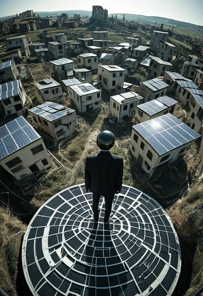Shot with a fish-eye lens. A surreal Melting from a Solar-Maze panels , Vertigo Art style , lone figure stands on the edge of a building , gazing down at a sprawling Vintage village below , now partially reconstructed and overgrown with Solar panels. The buildings tilt and twist , creating a sense of imbalance and disorientation. Use a sophisticated color palette of ebony and pearl to evoke a sense of elegance and refinement. ,