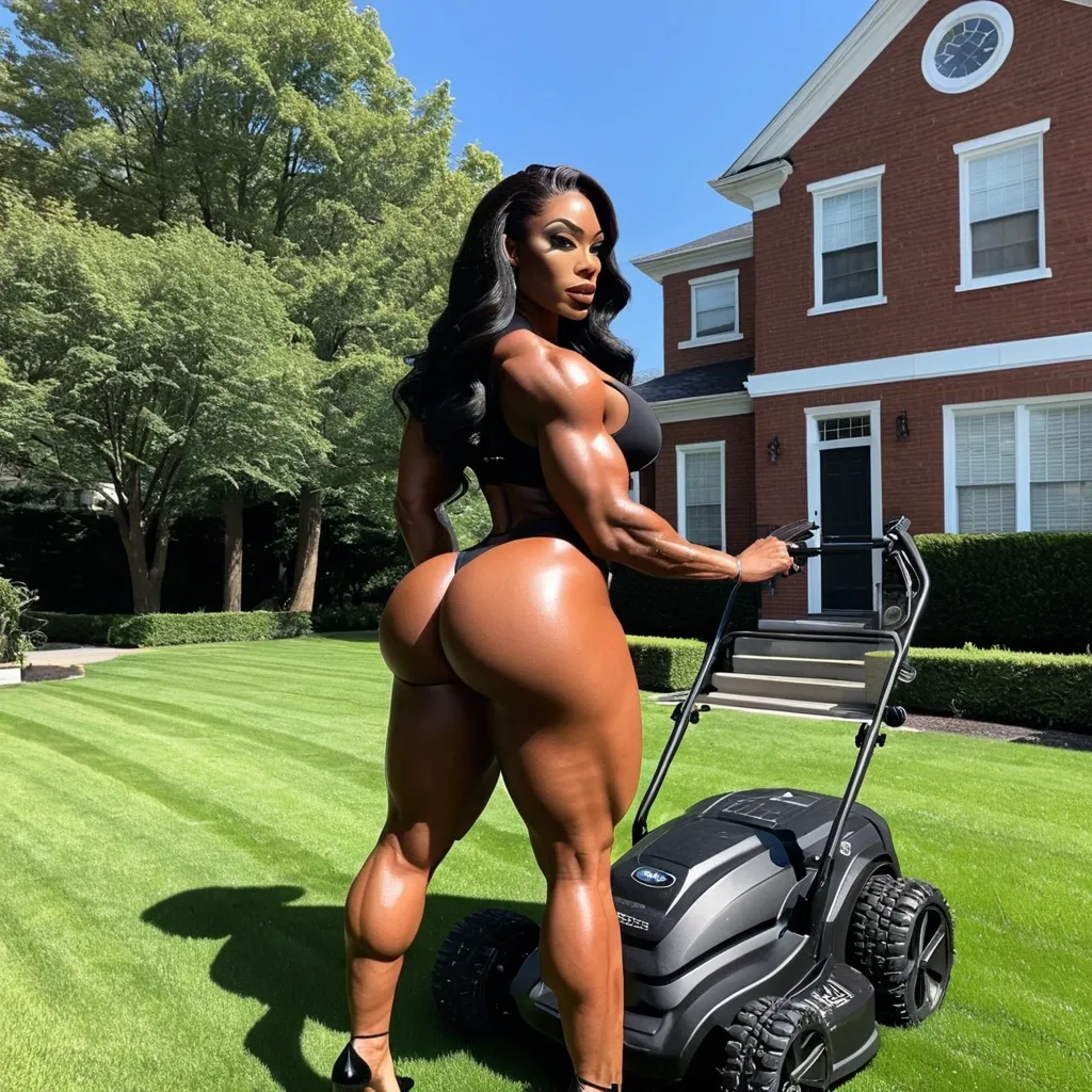 Generate Gorgeous female boss , African-American woman , 24 years old , Adrienne-Joi Johnson , abnormally massive female bodybuilder , gorgeous , close up , full lips , big booty , feminine silhouette , too big breast , enormous breast , beautiful brown eyes , black and purple hair styled designed bald-headed on the side with braids on top of head , big booty , curvy hips , toned legs , legs are famously muscular , thick , and powerful , showcasing years of intense martial arts training. The thighs are especially prominent , with a sculpted , rounded fullness that conveys both raw strength and feminine allure. The calves are equally defined , tapering down with precision , giving a sense of balance and agility. Every detail emphasizes explosive kicking power , making the legs an iconic symbol of dominance , athleticism , and beauty within the fighting game world. outfit consists of a form-fitting , short-sleeve polo dress in a medium denim-blue shade. The dress is cut above the knee , accentuating her curves with a bodycon silhouette that hugs tightly around the bust , waist , and hips. It features a collared neckline with a few buttons undone , adding a casual yet subtly sophisticated touch , while a small embroidered white logo on the chest lends it a sporty , branded edge. The short sleeves are cuffed with a white trim , giving the look a crisp finish that balances out the figure-hugging design.To complement the dress , she carries a structured handbag in a matching blue tone , creating a polished monochromatic coordination. The handbag has a sleek rectangular shape , a short strap , and a metallic clasp that adds an element of refinement. Her accessories are minimal yet purposeful: a bracelet on one wrist , a delicate necklace , and earrings that frame her face without overwhelming the outfit. In her other hand , she holds a pair of keys , adding to the everyday realism of the look while still maintaining elegance.For footwear , she wears sporty blue-and-white sneakers that tie the entire ensemble together. The choice of sneakers instead of heels grounds the outfit in a casual chic aesthetic , blending feminine curves with an athletic undertone. This contrast highlights her commanding silhouette while keeping the look approachable and versatile—perfect for daytime city outings where style and comfort must coexist. The overall effect is bold , sleek , and modern , emphasizing her confident presence. Standing in beautiful back yard mowing the lawn with lawn mower ,