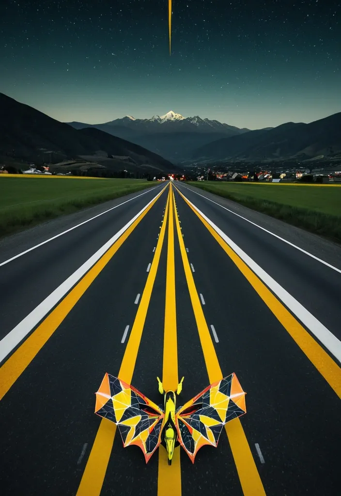 Looking down an open asphalt road lined with a bold yellow center line and two white edge lines , in a Aztec style , skydiver mid-fall , their jumpsuit transforming into a cascade of vibrant , bat-like Fractal wings descending from a tessellation , showing mountains , mirroring the journey of adaptability and growth. On either side of the road , green fields roll gently under the night sky , while iconic Red Ferrari car at distance on road. The image evokes a sense of movement , presence , and the rhythm of change. ,