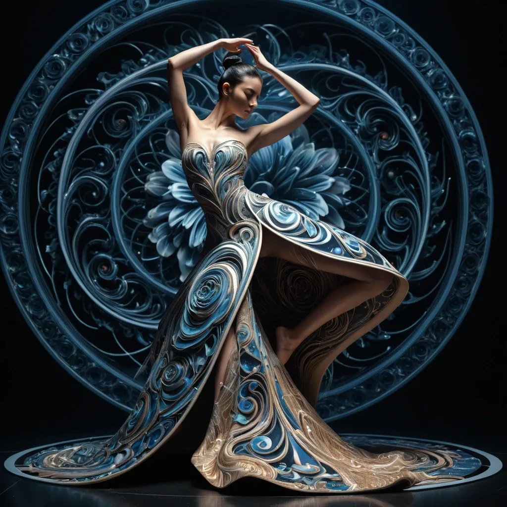 A woman with dark hair tied in a sleek ponytail , wearing an elaborate strapless gown made of Fractal Flora , inlaid with intricate patterns of rose , lotus palette and leaves expressed through a Luminescent Kinetic Whirl , posing elegantly with hands on her hip and head tilted back , one leg bent and foot raised , against a dark drama-stage background. The gown flows into a dramatic train that forms a large , vortex on the ground and curves upwards into a series of large. Style: Photo-realistic , Conceptual Art Lighting: Dramatic Studio Lighting , Spotlight Composition: Full body shot , dynamic pose , central focus with a grand , swirling element Details: Intricate embroidery on the dress and sculptural elements , high contrast between silk-toned golden and creamy blue , smooth skin texture , graceful human form , conceptual and architectural elements. Quality: High Detail , 8K , Masterpiece , Rendered with meticulous texture and reflective surfaces ,