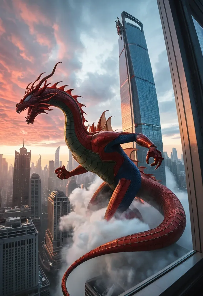 A majestic , sweeping panoramic photograph , captured with a wide-angle lens , showcasing a futuristic metropolis at dusk , a surreal Spider-Man in an epic battle against a massive Chinese dragon rises out from a skyscraper's window emitting clouds of white smoke that billow out of it. To the right of the Window is a skyscraper. A massive , mythical dragon's tail , coiled like a dinosaur or snake , emerges from within the skyscraper's window. The tail rises to the center of the top of the image , where the dragon is twisted in the air in a line facing leftward. Its body is in the center of the image , and it is glowing red in the light of a luminous sky behind it. The right side of the creature's body borders the edge of the image. ,