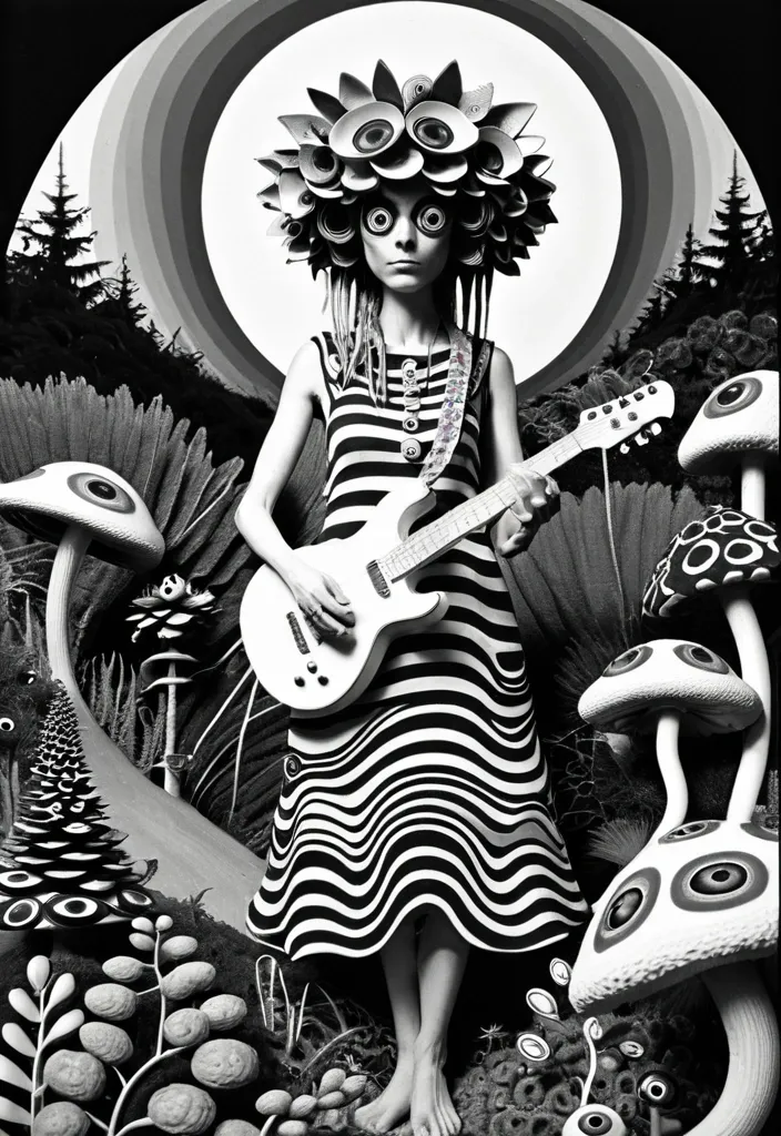 A color-xerox-looking psychedelic collage depicting an alien , dreamlike landscape composed of black and white and other optical illusion patterns , surreal organic , eye-like lifeforms and biomorphic structures , layered and arranged as if cut , assembled , and recomposed from multiple surreal realities. The scene feels like a collaged ecosystem built from perception itself — eyes embedded in plants , eyes floating independently , eyes growing on stalks , cones , mushrooms , and soft sculptural forms. Some eyes are realistic and detailed , others simplified , graphic , striped , or abstracted. A 1970 USA California a mature woman , wearing a colorful hippie dress with a flower wreath in her hair and playing a guitar. Elements overlap unnaturally , with intentional scale mismatches and layered planes that flatten and re-expand space. ,