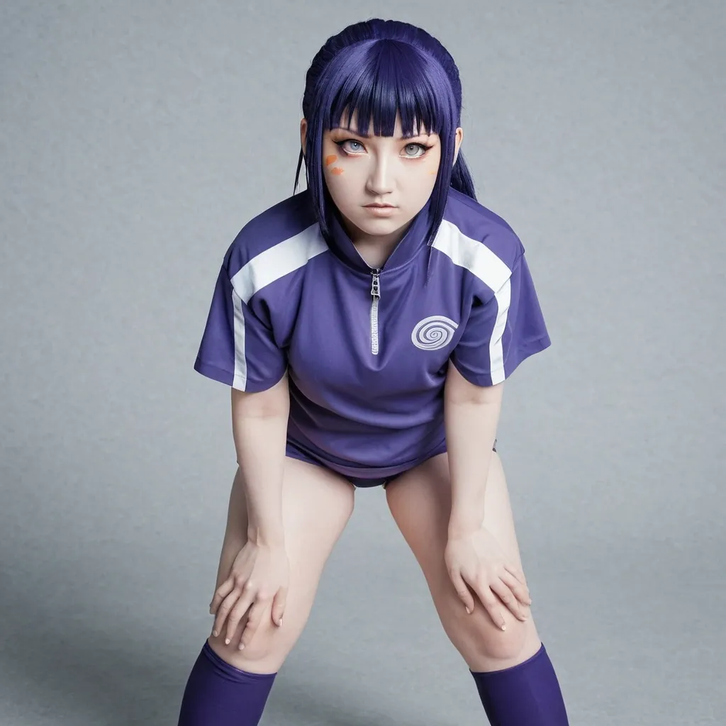 The face of the character in the picture is like that of Hinata Hyuga from Naruto , with light white pupils that have no obvious iris. The hair is long , black-purple in color , and styled in a hime cut. The complexion is rosy , and the skin has a texture like white porcelain. The character is dressed in strips of cloth , with a chest wrap. The body shape is like that of Tsunade. The whole body is sweating profusely , and the clothes are soaked through with sweat. There is a Konoha symbol around the neck. It is a full-body portrait of the character , located in a blurred Japanese-style courtyard. The scene is in high definition with a cyberpunk background. The character is lying on the ground and viewed from a low angle. Enhance the realism of the character's hair , showing the entire body down to the feet. Strengthen the slender waist and emphasize the abdominal curve. Increase the cup size of the chest by ten cups , and make the chest hang naturally. ,